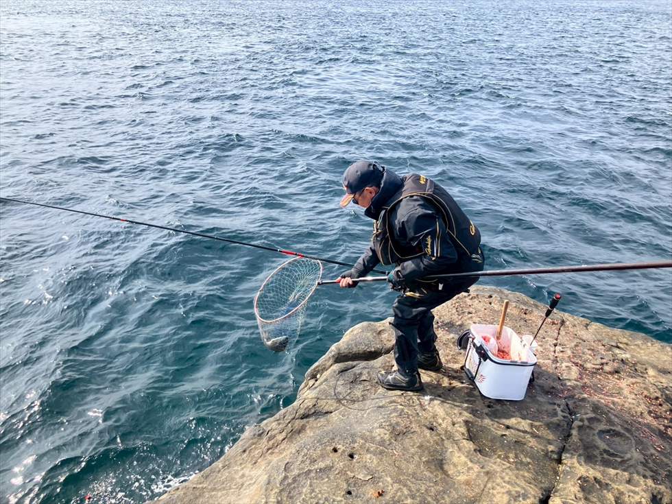 さっき逃がしたのよりは小さいが、まあまあのサイズのグレを取り込み、岡上君と立ち位置チェンジ。