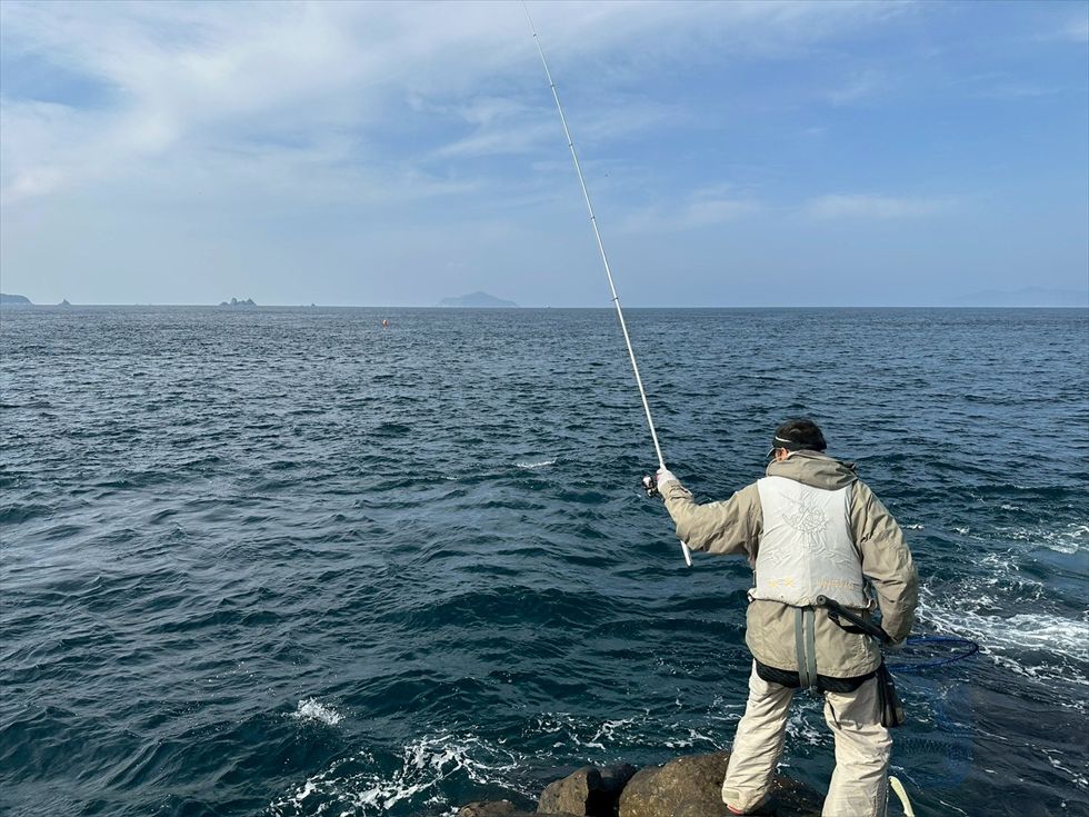 となりで伊与田さんが後からゆっくり構えて1投目、早くも大物をかけました!やり取りするも、ハリス切れとなりました。